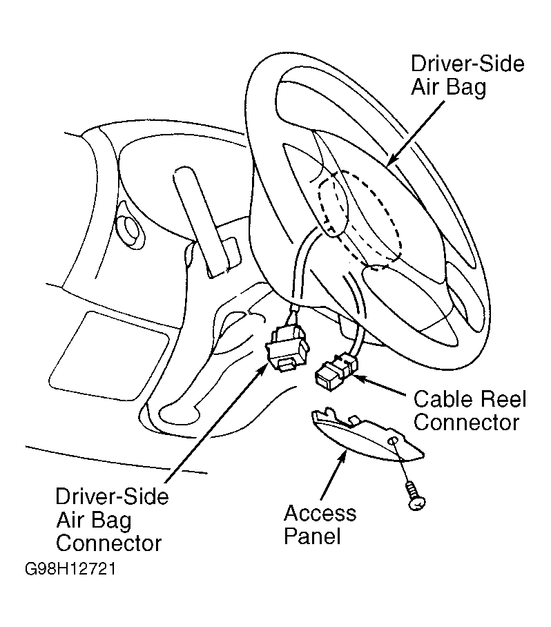 Turn ignition off. Disconnect battery cables. Wait at least 5 minutes to allow capacitor in back-up circuit to discharge. Remove access panel below driver's air bag on steering wheel. See Figure. Disconnect driver-side air bag 2-pin connector from cable reel 2-pin connector.