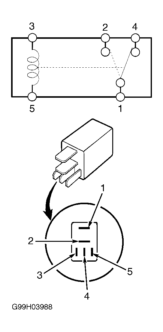 9. Check for continuity between the No. 1 and 4 terminals of the shift lock relay while connecting the battery positive terminal to the No. 5 terminal of the shift lock relay and connecting the negative terminal to the No. 3 terminal. See Fig 3. Is there no continuity when connecting the battery terminals, and continuity when disconnecting the battery terminals. If yes, go to next step. If no, replace the shift lock relay.