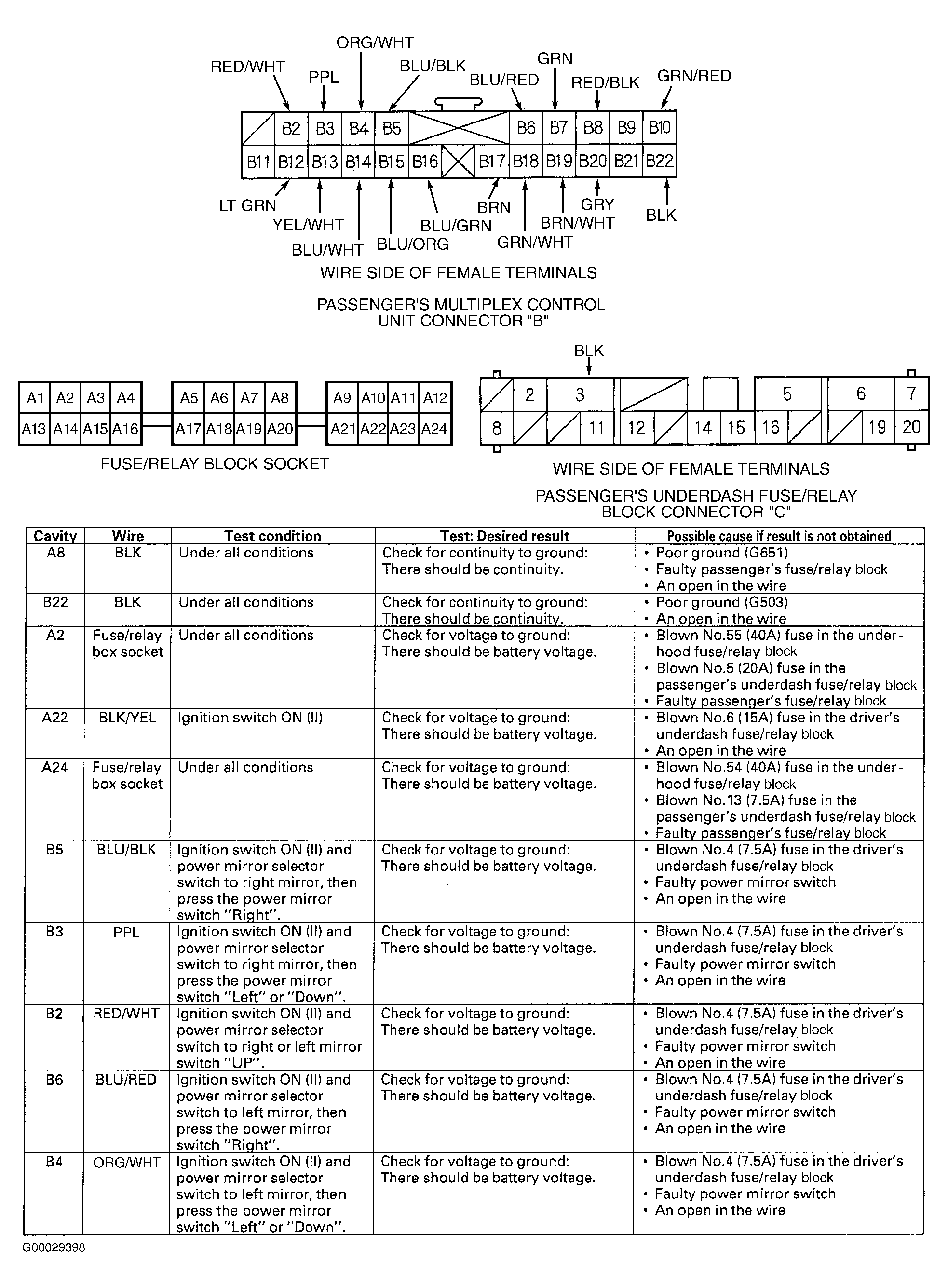 - Using DVOM to backprobe, measure voltage between passenger's multiplex control unit connector terminals B2 (Red/White wire) and B22 (Black wire) while holding mirror switch UP. If battery voltage exists, go to next step. If battery voltage does not exist, repair open circuit in Red/White wire between passenger's multiplex control unit and power mirror switch, or in Black wire between passenger's multiplex control unit and ground. See WIRING DIAGRAMS .