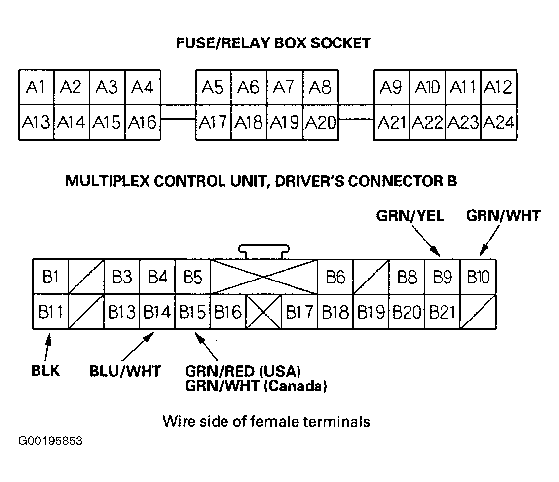 Remove driver's multiplex control unit from driver's under-dash fuse/relay box, and disconnect connector. See Fig 1 . Inspect connector and terminals for damage, and to ensure they are making good contact. Repair or replace as necessary, then recheck system. With connector still disconnected, perform input tests at connector and driver's under-dash fuse/relay box sockets. See Fig 2 . Repair or replace any parts as necessary.