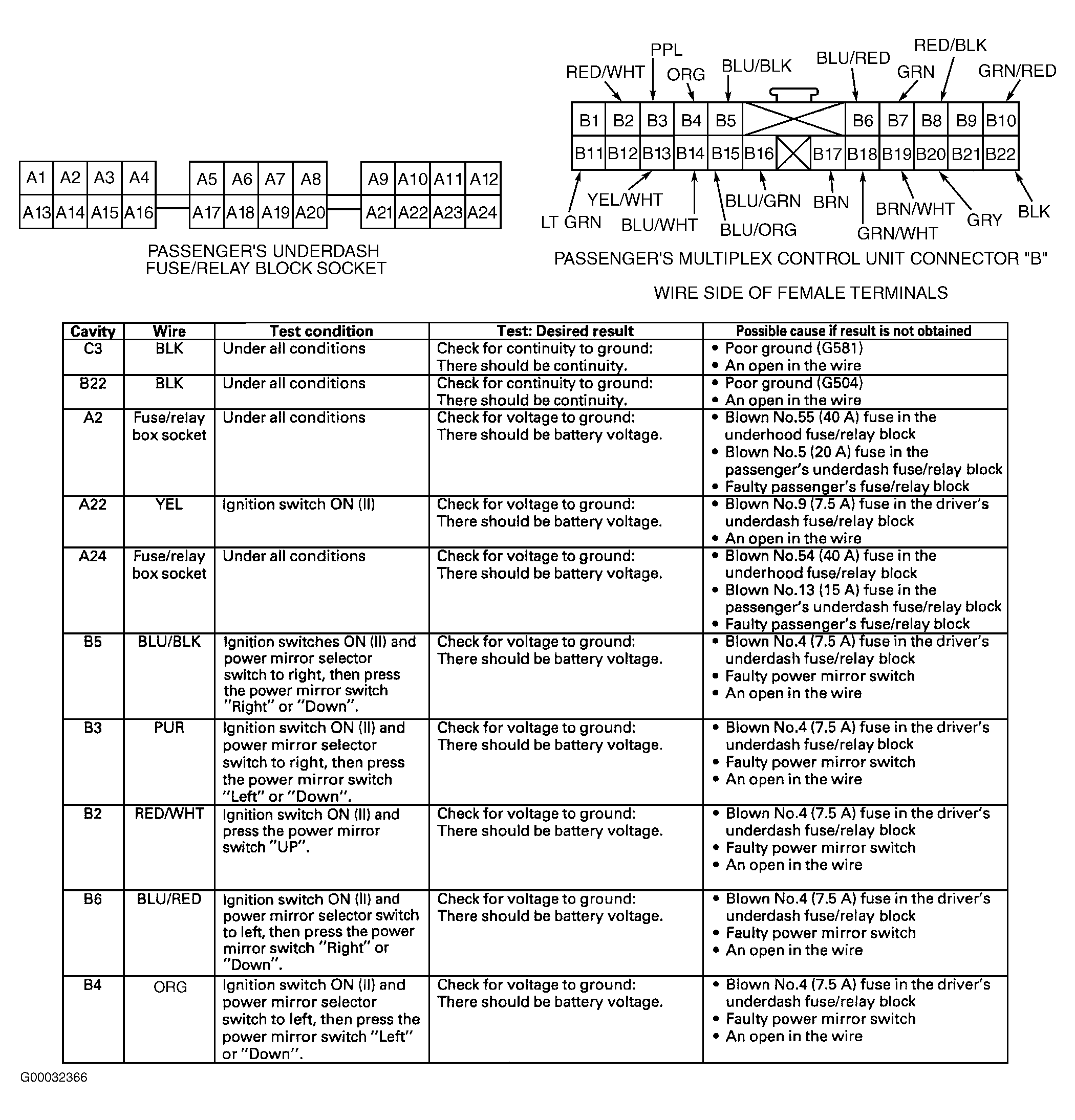 Remove passenger's multiplex control unit from fuse/relay block located behind passenger's kick panel. Disconnect passenger's multiplex control unit connector and check for bent, loose or corroded terminals. Repair as necessary. If all terminals are okay, perform input tests at passenger's multiplex control unit and fuse/relay block connectors. See Fig 1 and Fig 2 . If all input tests are okay, go to DRIVER'S MULTIPLEX CONTROL UNIT  .