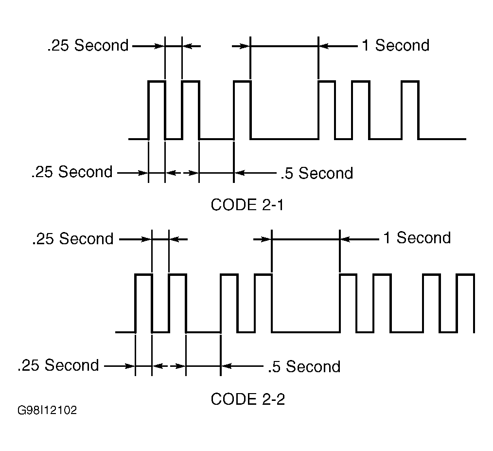 5. If the registration was complete and system is operating normally when ignition key was removed from ignition lock cylinder, the SECURITY indicator light should flash. If ignition key registration was not completed with transponder key Electronic Control Unit (ECU) in automatic registration mode, a code 2-1 will be displayed by SECURITY indicator light. See Fig 1. When inserting an already registered ignition key, a code 2-2 will be displayed by SECURITY indicator light. See Fig 1.