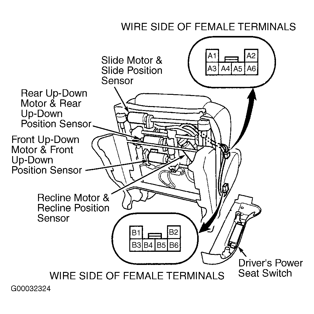 Remove driver's seat. See FRONT SEAT under REMOVAL & INSTALLATION. Disconnect power seat switch connectors. See Fig 1 . Apply battery voltage to each terminal as specified in DRIVER'S POWER SEAT MOTOR table. If any motor fails any portion of test, check wiring between power seat switch connector and motor. Repair as necessary. If wiring is okay, replace faulty motor.
