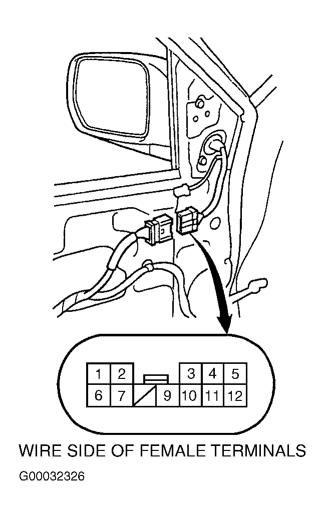 Remove appropriate door panel and disconnect power mirror motor connector. See DOOR PANEL under REMOVAL & INSTALLATION. See Fig 1 . Using fused jumper wires, check motor operation by applying power and ground as specified. See POWER MIRROR MOTOR TEST table. If motor does not function as specified, replace appropriate motor assembly.