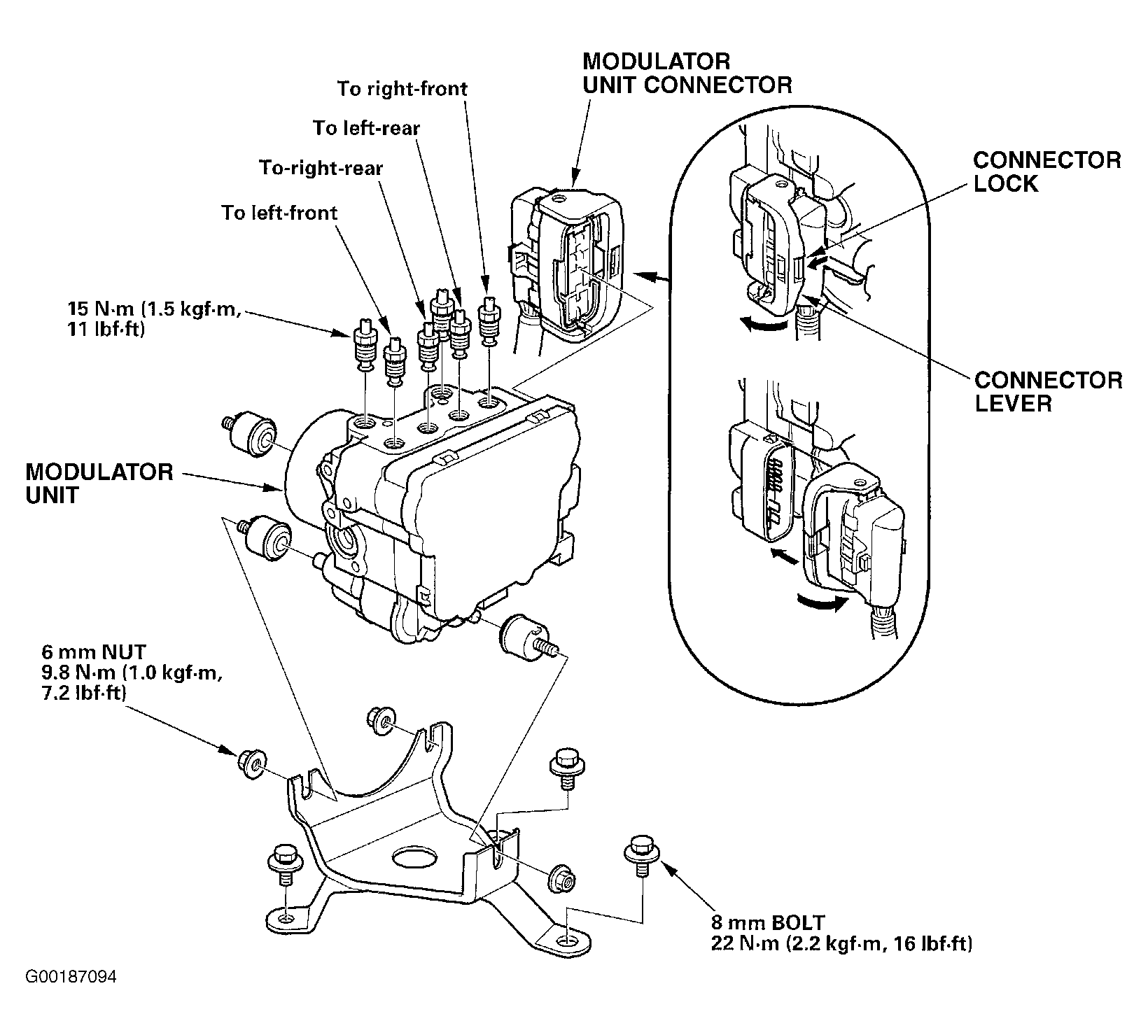 Push the modulator unit connector lock, and turn the connector lever. See Fig 1 . Disconnect the modulator unit connector. Disconnect the brake lines, then remove the modulator unit.