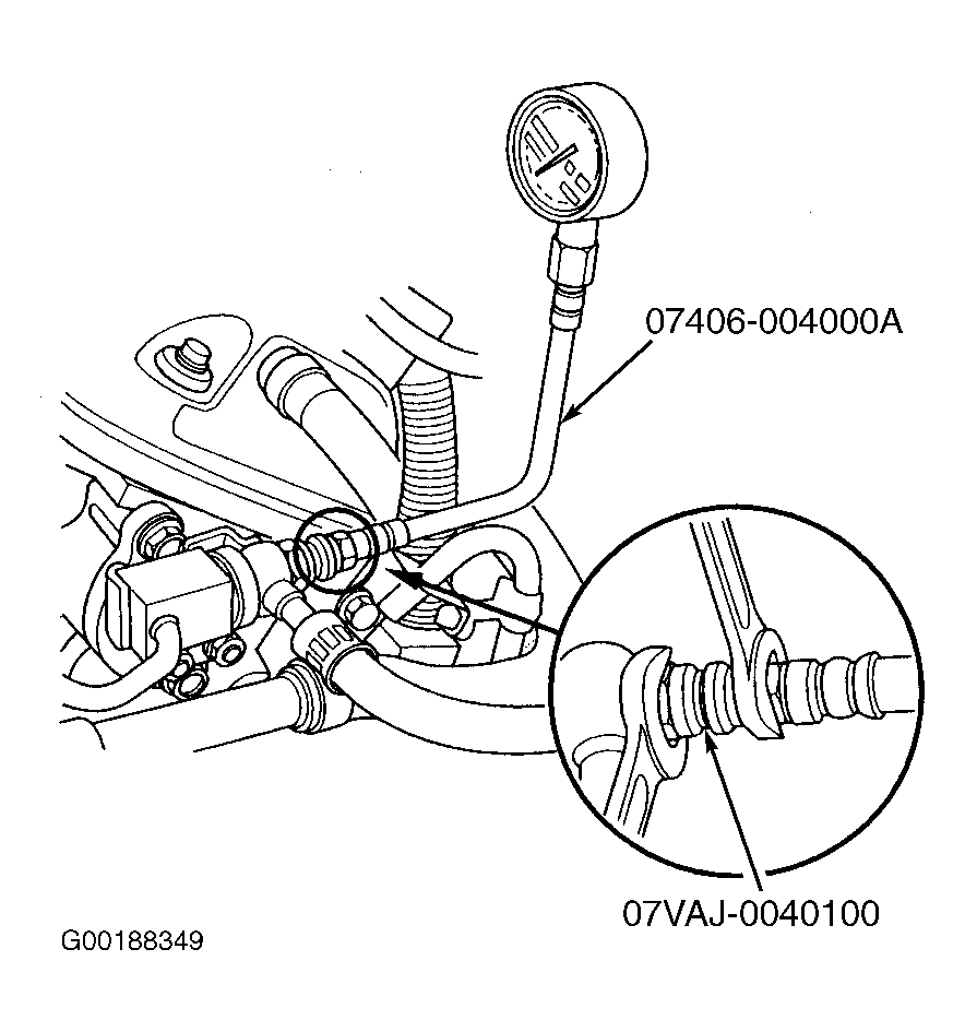 - Remove fuel line bolt and install fuel pressure gauge adapter (07VAJ-0040100). Attach fuel pressure gauge. See Fig 1