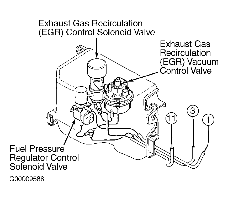 . See appropriate wiring diagram under ENGINE PERFORMANCE in WIRING DIAGRAMS. Check for vacuum at fuel pressure regulator vacuum hose No. 1. If manifold vacuum is not present, fuel pressure regulator control solenoid valve is okay. If manifold vacuum is present, repair open in Red/Green wire between PCM 26-pin harness connector terminal No. 10 and control box connector 4-pin harness connector terminal No. 3.