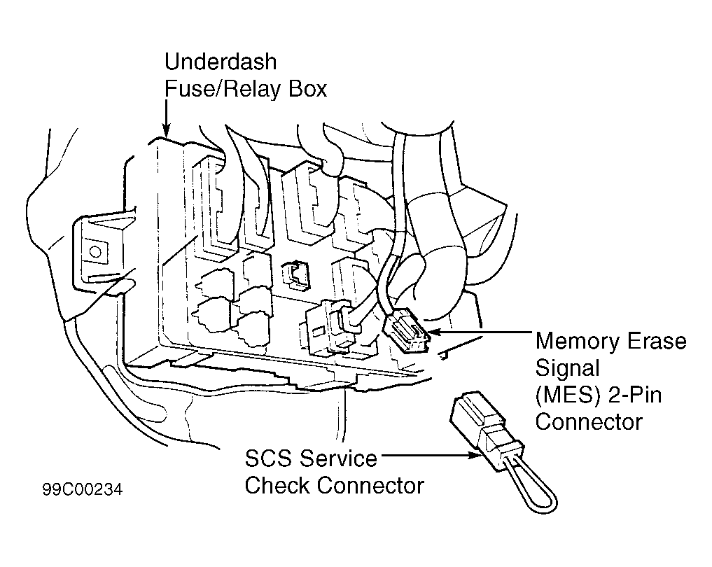 - Turn ignition off. Connect SCS Service Connector (07PAZ-0010100) to Memory Erase Signal (MES) connector. See Fig 1.