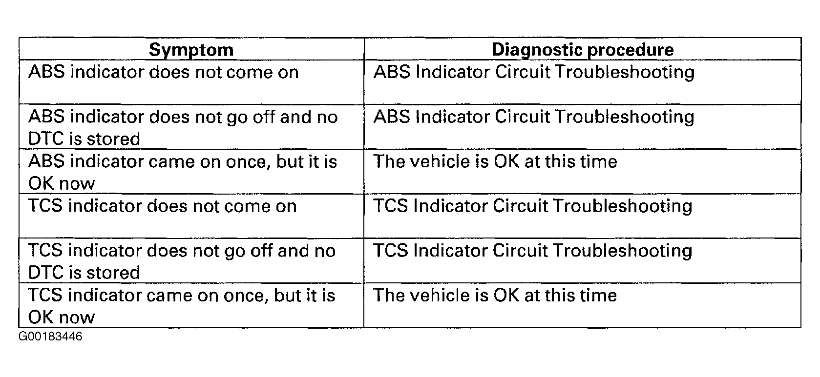 - When the ABS and TCS indicators are both ON, trouble shoot the ABS first.
