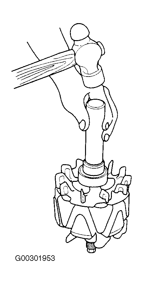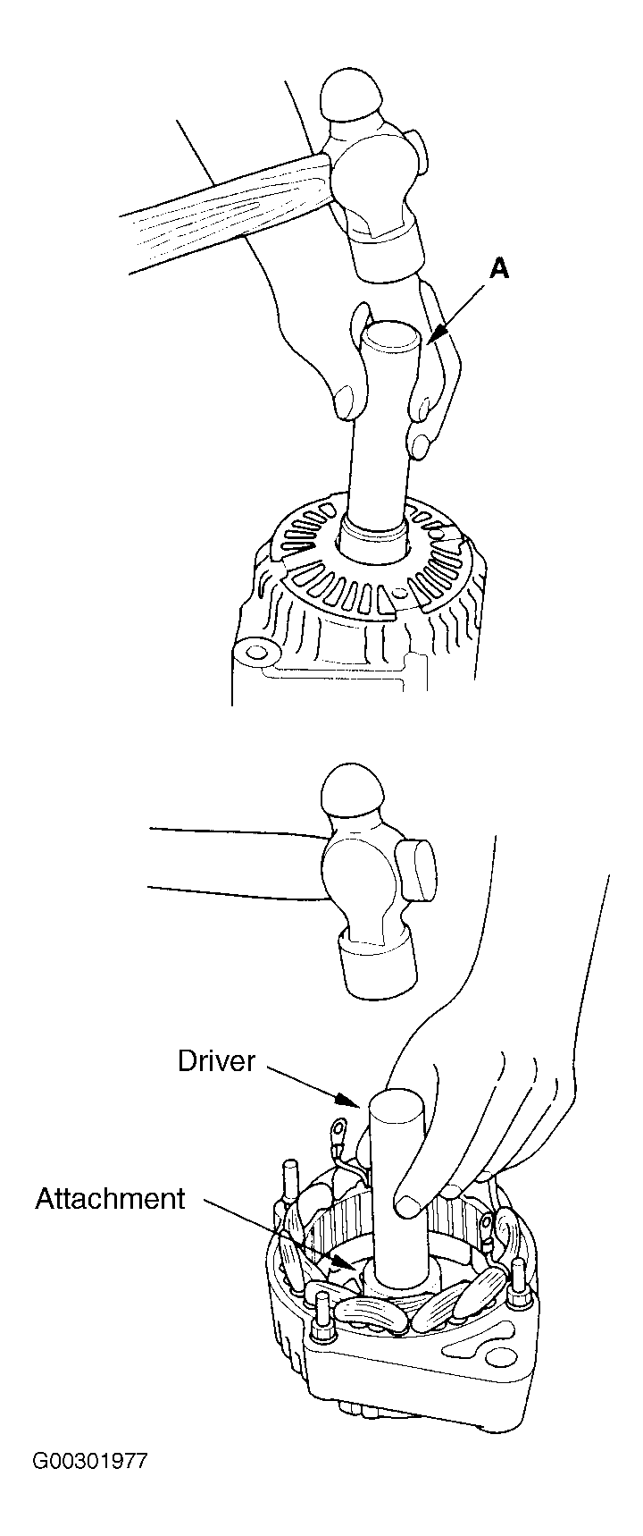 16. Support the stator housing in a vise, and drive out the front bearing with a brass drift "A" and hammer.