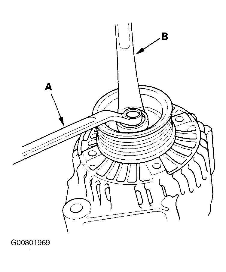 3. If the front bearing needs replacing, remove the pulley locknut with a 10-mm wrench "A" and a 22-mm wrench "B". If necessary, use an impact wrench. See Fig 2.