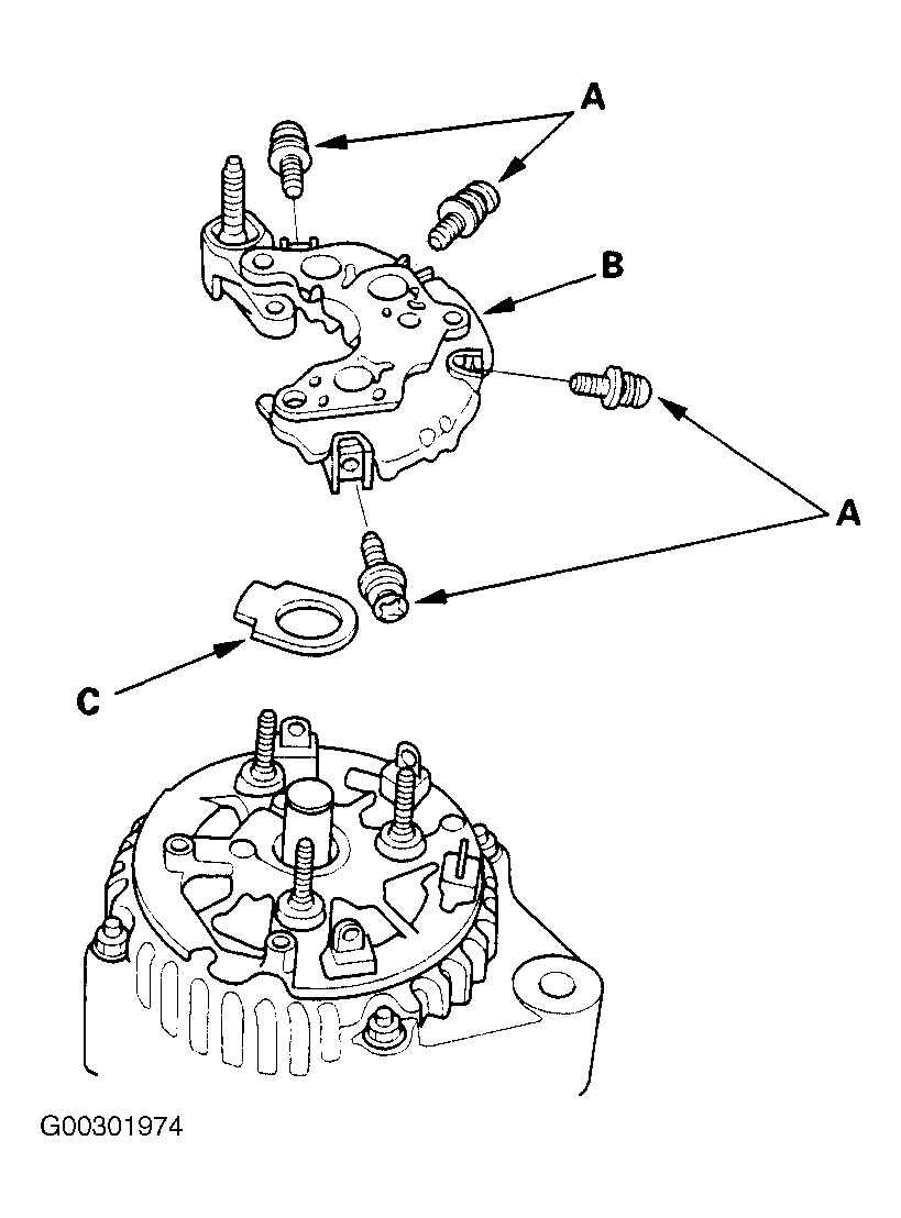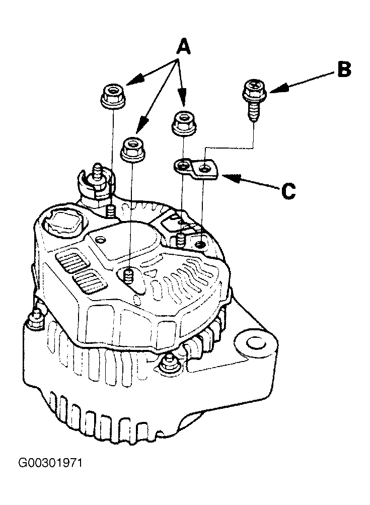 4. Remove the three flange nuts "A" and the screw "B" from the alternator, then remove the plate terminal "C". See Fig 3.