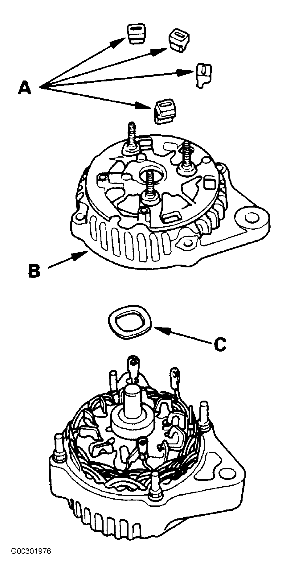 10. Remove the 4 insulators "A" rear housing "B" and washer "C". See Fig 9.