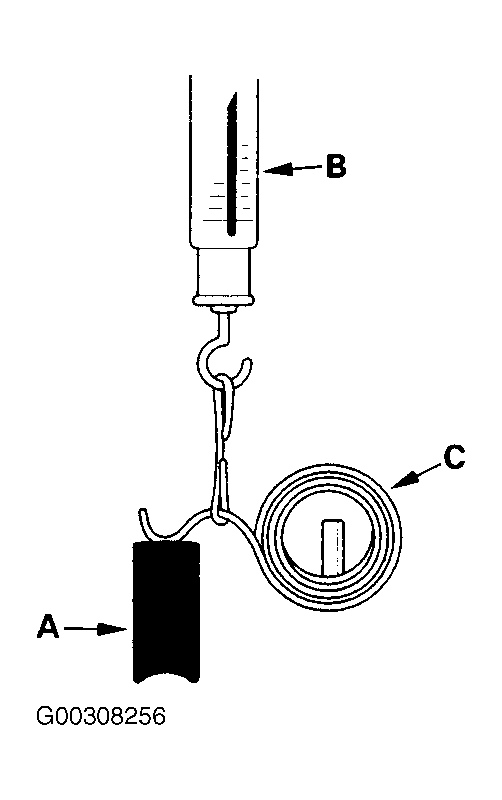 Insert the brush (A) into the brush holder, and bring the brush into contact with the commutator, attach a spring scale (B) to the spring (C). Measure the spring tension at the moment the spring lifts off the brush. See Fig 1 . If the spring tension is not within specification, replace the spring. See STARTER SPECIFICATIONS  .
