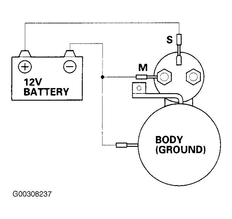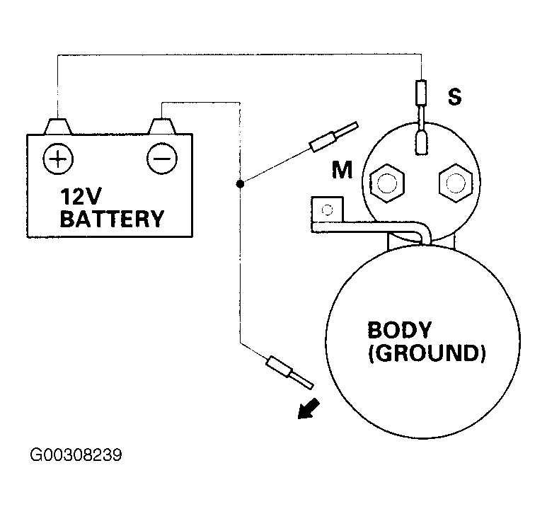 4. Disconnect the battery from the "M" terminal. If the pinion does not retract, the hold-in coil of the solenoid is working properly. See Fig 2 .