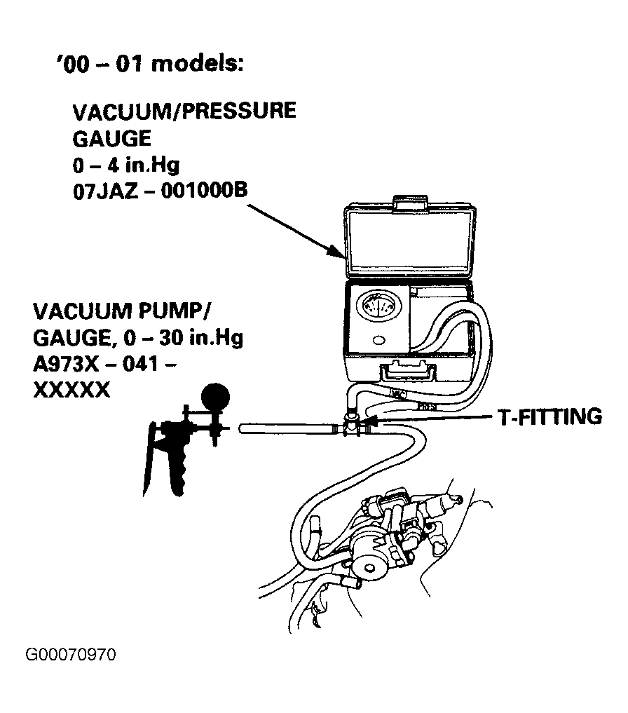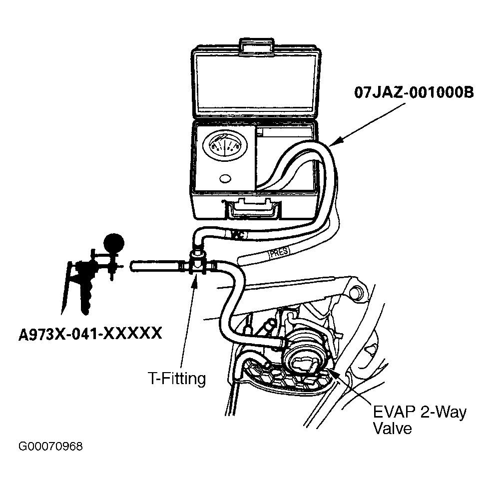 - Remove fuel filler cap. Remove fuel tank vapor hoses from EVAP 2-way valve. For location of EVAP 2-way valve, see VACUUM DIAGRAMS article. Connect hose to available EVAP 2 way valve port from "T" fitting connected to a vacuum pump/gauge. See Fig 4