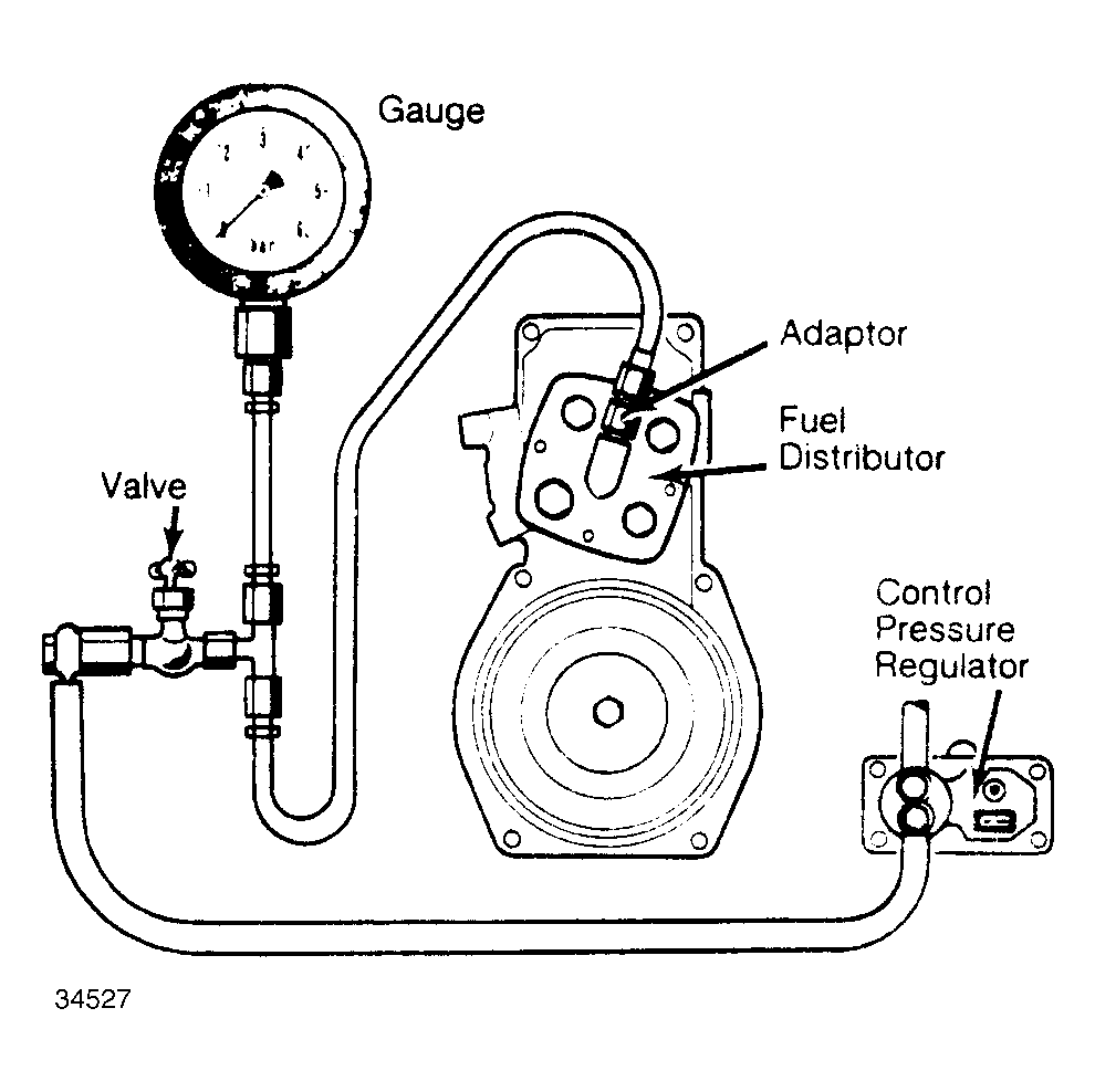 - Install a pressure gauge to perform fuel pressure tests. On all models, pressure gauge is installed between the control pressure regulator and the center fitting on fuel distributor. See Fig 1 .