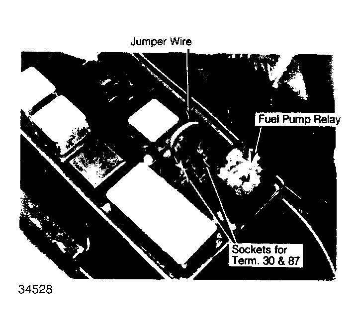 - To operate fuel pump with engine not running, disconnect fuel pump relay from relay panel. Insert a jumper wire into sockets that correspond to terminals 30 and 87 on relay. See Fig 2 .