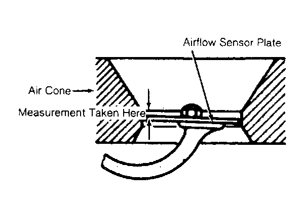 1. With engine off, upper edge of airflow sensor plate must be .118-.875" (1.9-3.0 mm) below edge of air cone. See Fig 1 .
