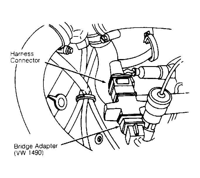1. Disconnect and ground ignition coil wire. Disconnect Coolant Temperature Sensor (CTS) harness connector and insert 15,000-ohm side of Bridge Adapter (VW 1490) into CTS harness connector. See Fig 2 .