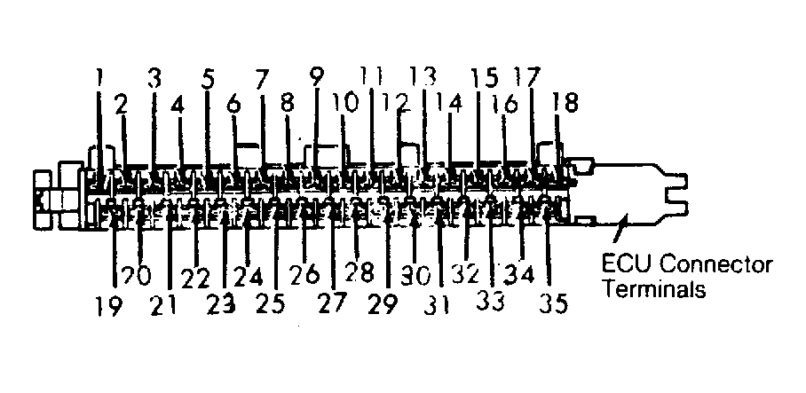 - Turn ignition on. Voltmeter reading should be greater than 9 volts. If reading is not as specified, check for open circuit in wiring between ECU terminals No. 23 and No. 25, and Hall Effect sending unit. See Figure for ECU terminal identification.