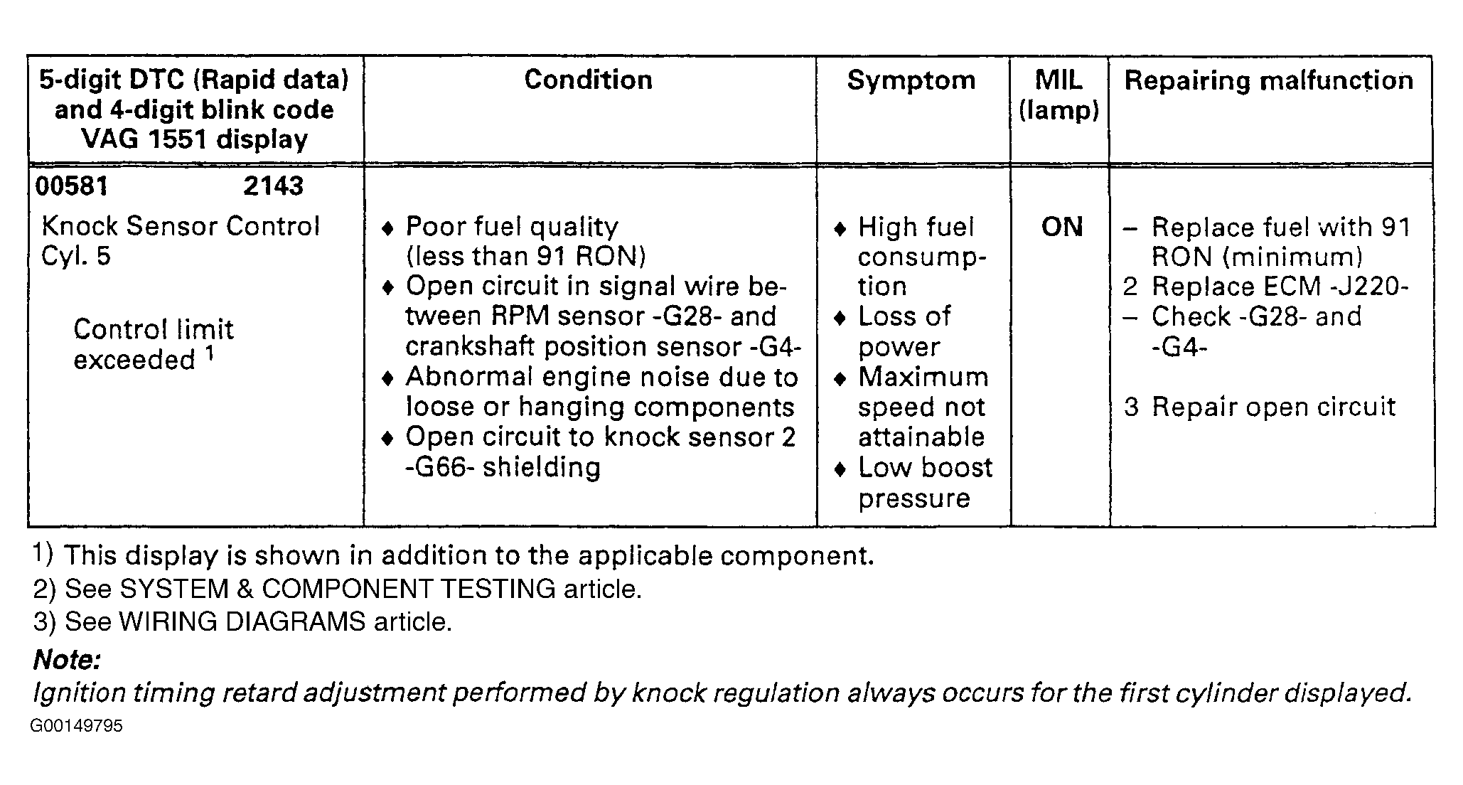 DTC 00581/2143 - Knock Sensor Control CYL. No. 5.