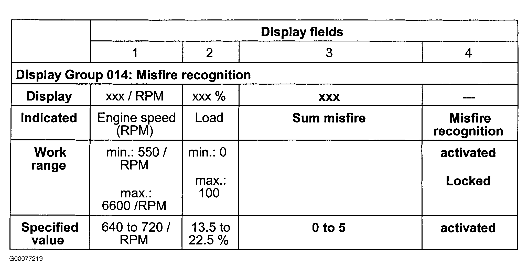 - On scan tool observe misfire recognition in display fields No. 3 and 4. See Fig 1 . If displayed value is not obtained, go to next step. If displayed value is obtained, go to step 4 .