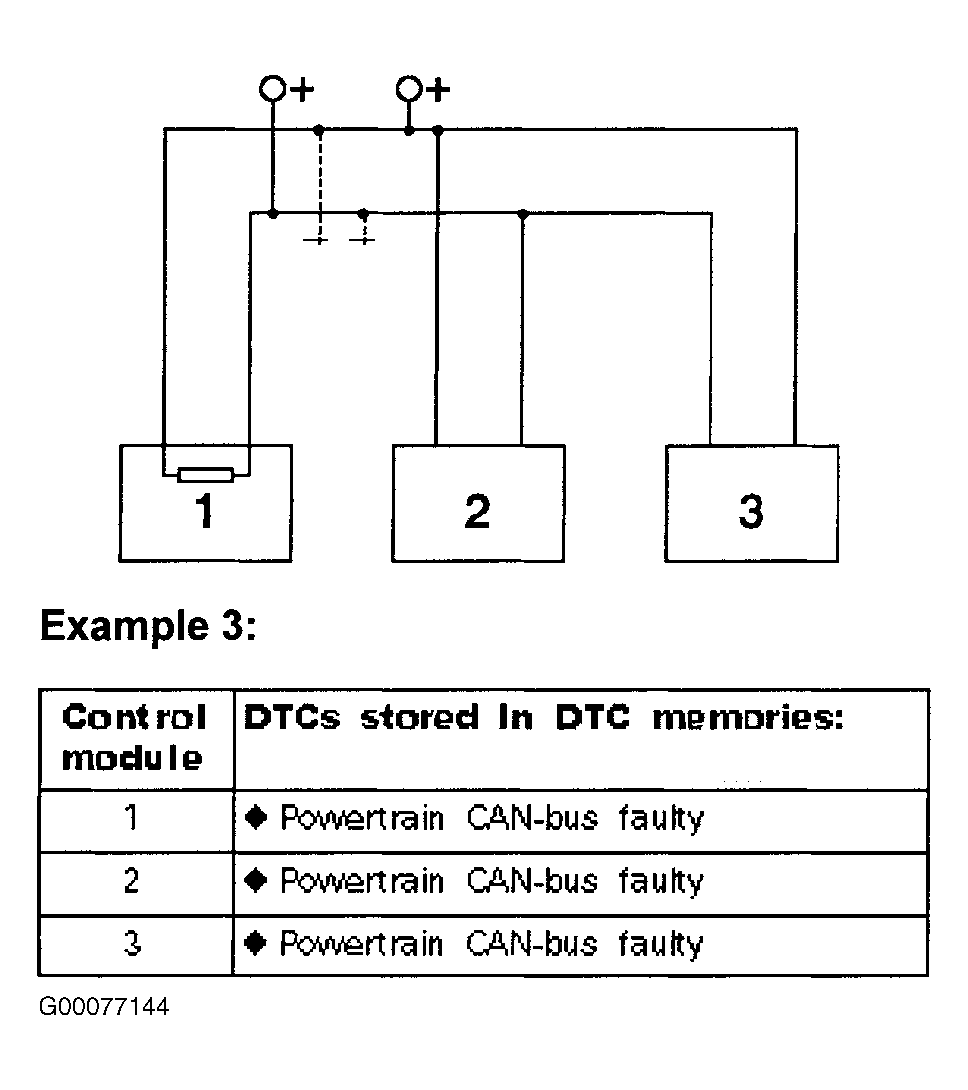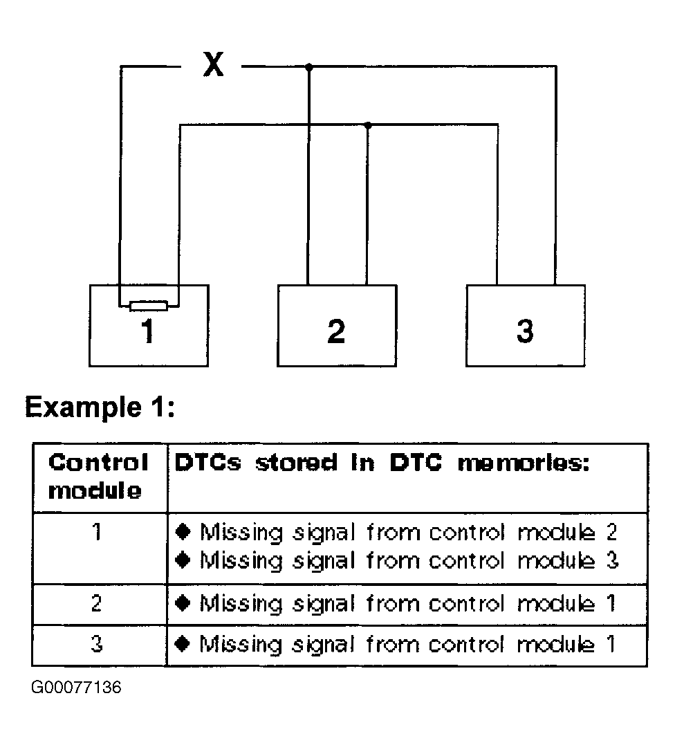 5. Using stored DTCs and data link connectors wiring diagram, analyze which control modules are not communicating. See DATA LINK CONNECTORS article in ACCESSORIES & EQUIPMENT. Use example in illustrations to determine non-communicating modules. See Fig 1 - Fig 3 . Turn ignition off. Disconnect CAN-bus connected control module harness connectors. In examples 1 and 2 check for open circuits in bus wires of connected control modules. In example 3 check for short to voltage in bus wire circuits of connected control modules. If problem is found, repair as necessary. If no problem is found, replace suspect control module. Go to next step.