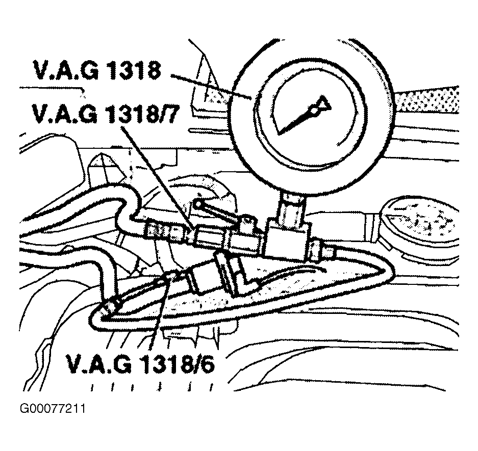 - Connect Pressure Gauge (VAG 1318) between fuel supply and fuel return lines in engine compartment. See Fig 1