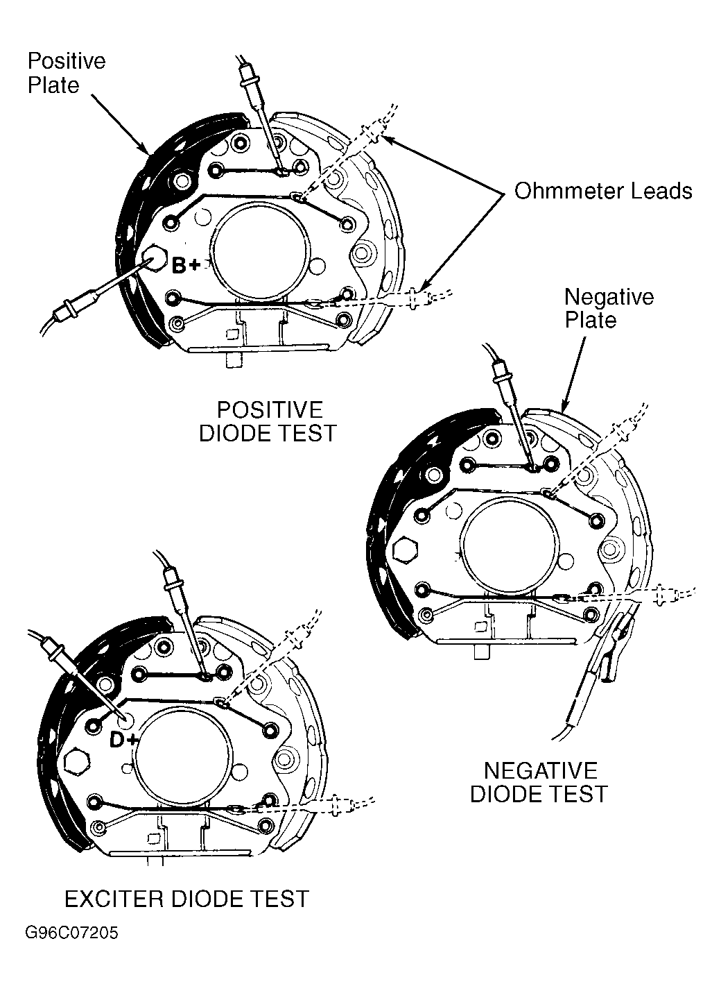 - Connect ohmmeter leads between Blue (D+) wire terminal and each 3 stator terminals, in turn. Reverse ohmmeter leads. If ohmmeter indicates continuity in only one direction, diode assembly is okay. If ohmmeter indicates continuity in both directions, replace diode assembly.