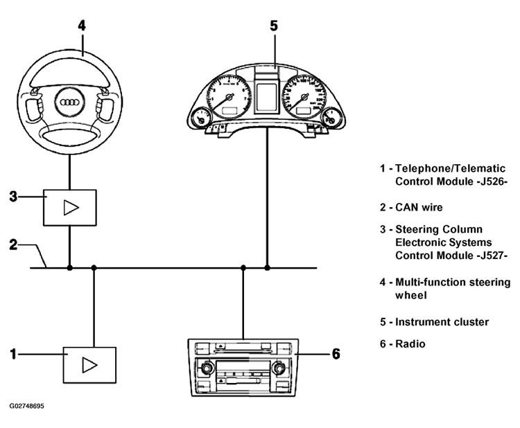 - Terminal assignments/harness electrical connections of Steering Column Electronic Systems Control module -J527- . See TERMINAL ASSIGNMENTS/HARNESS ELECTRICAL CONNECTIONS ON STEERING COLUMN ELECTRONIC SYSTEMS CONTROL MODULE -J527- (FRONT) .