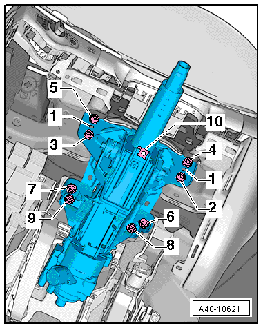 - Removing and installing. Refer to Electronic Steering Column Lock Control Module -J764-, REMOVING AND INSTALLING .