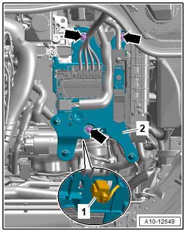 -- Install the bolts -arrows- for the transmission mount -1- by hand all the way.
