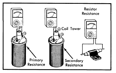Set an ohmmeter in the low scale. Be sure ignition switch is "OFF". Check resistance of each resistor in the primary circuit. See Figure. Some manufacturers use resistor wires instead of ballast resistors. Most use 2 ballast resistors.
