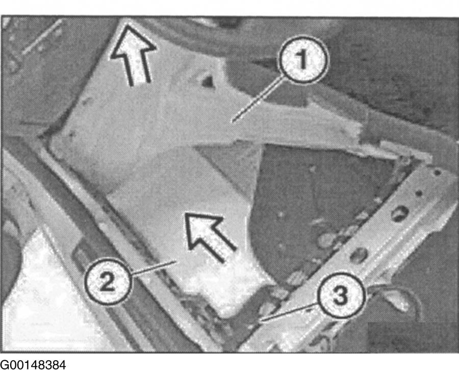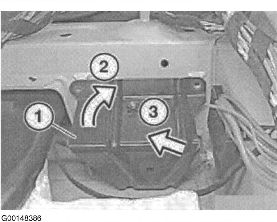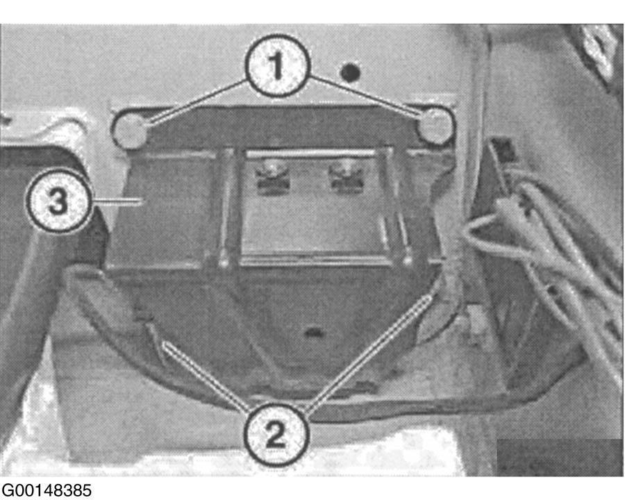 - Raise floor trim panel (1). Move insulating wedge (2) approximately 3-4 inches (8-10 cm) forward to gain access to rotation rate sensor (3). See Fig 1.