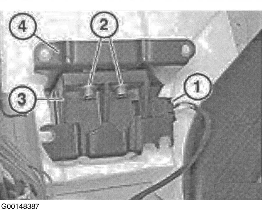 - Unfasten plug connection (1) and disconnect. Release screws (2) and remove rotation rate sensor (3) from bracket (4). See Fig 4.