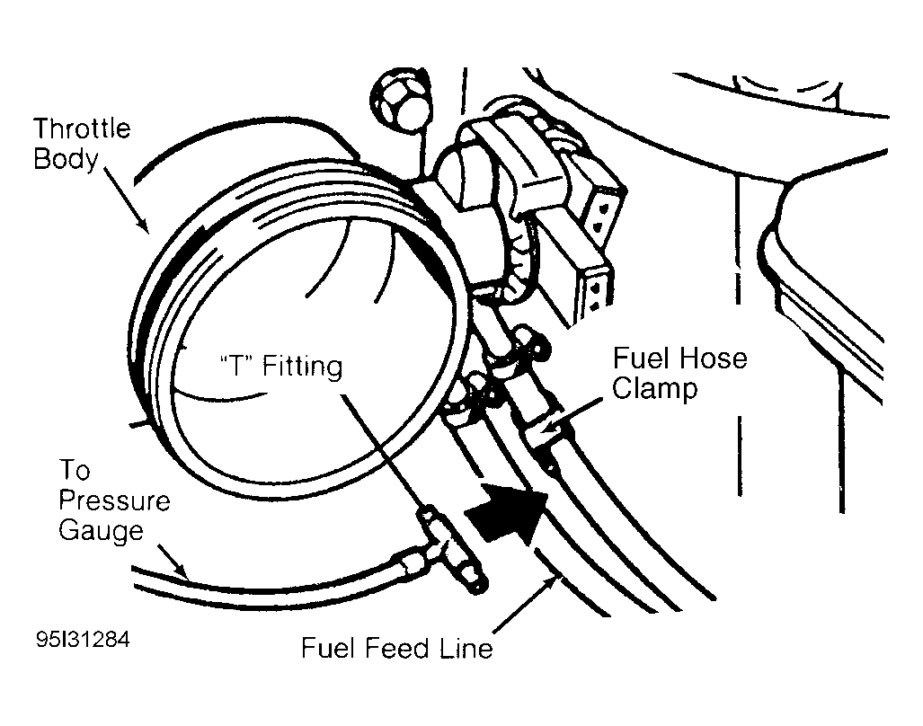 1. Remove air intake duct to gain access to fuel lines near throttle body. Connect Pressure Gauge (13-3-060) and "T" Fitting (13-3-064) in fuel lines in front of fuel pressure regulator. See Fig 1 . Block (plug) fuel return line with Fuel Hose Clamp (13-3-010).