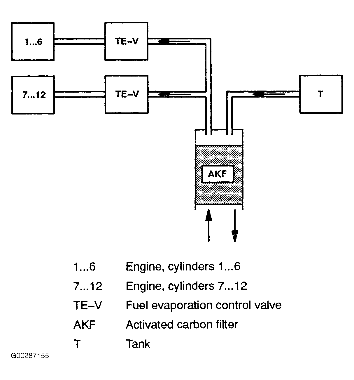 The fuel evaporation control line of the fuel tank is connected to an activated carbon filter, in which the fuel vapors which accumulate in the tank are collected. The activated carbon filter is linked by means of 2 further lines to the 2 air manifolds. A fuel evaporation control valve is installed in each of these 2 lines. When a fuel evaporation control valve is open, the vacuum in the air manifold draws in fresh air through the activated carbon filter. The fresh air flushes out the fuel collected in the filter and routes it to the engine for combustion. See Fig 1 .