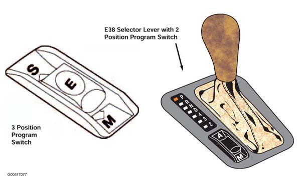 The transmission program switch is used to switch between various operating modes of the transmission. The normal default mode of the TCM is Economy which is indicated in the program display as "E". Economy mode allows the transmission to operate in the most efficient mode. Shift priorities are for maximum economy and shift comfort. On some vehicles the program switch is designated "A" for economy mode. Program switches come in 2 or 3 position configurations. Early vehicles with the 4HP (Early E7) used a rotary program switch.