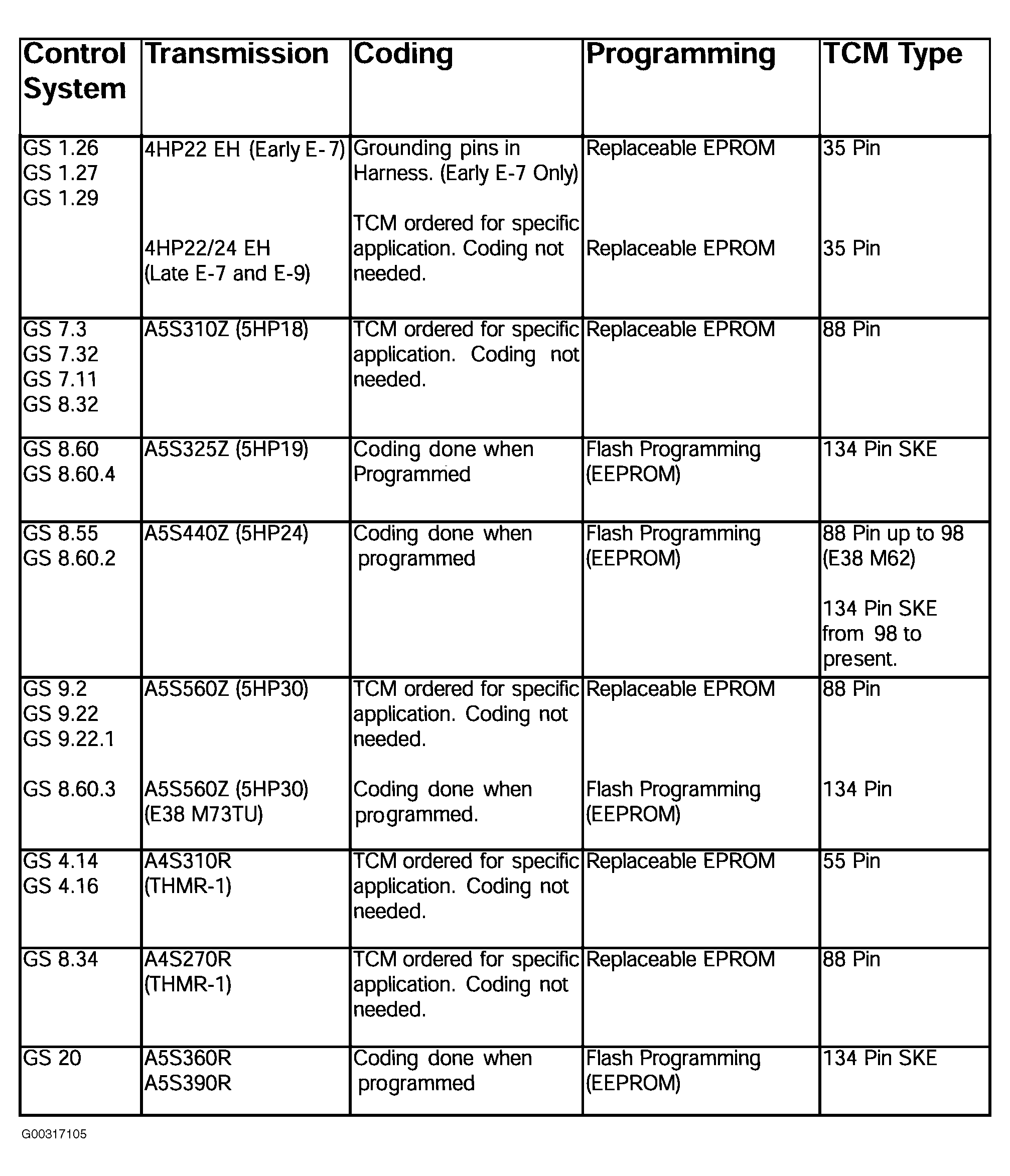 Programming refers to the instructions that the TCM is to follow. The TCM is programmed to apply certain shift maps according to operating conditions such as vehicle speed, engine speed, engine temperature, engine load and throttle position. This information can be entered into the TCM via an updated EPROM or through flash programming. Flash programmable control units use a EEPROM which is Electronically Erasable. The EEPROM is also soldered into the TCM and cannot be removed or replaced. Flash programmable TCM's can be programmed up to 14 times (with a new TCM). See Fig 1 .