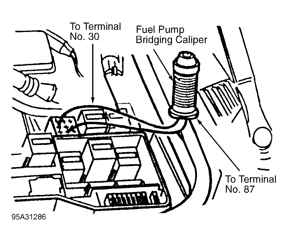 - Remove fuel pump relay. See DME & FUEL PUMP RELAY LOCATION table. Using Fuel Pump Relay Bridging Caliper (61-3-050) or jumper wire, connect (bridge) terminals No. 87 and 30 at fuel pump relay socket. See Fig 1 . This will turn fuel pump on.