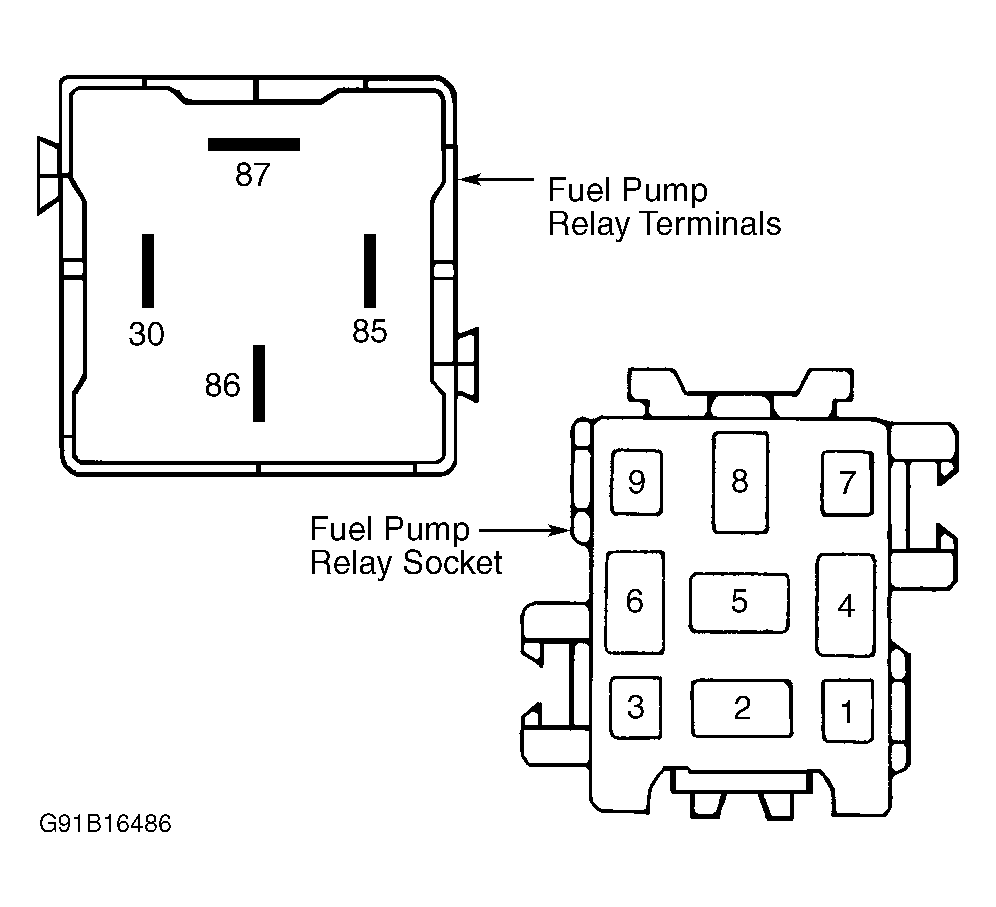 Remove fuel pump relay. Apply battery voltage to relay terminals No. 30 and 86. See Figure. Ground relay terminal No. 85. Voltage should now exist at relay terminal No. 87. Replace relay if it does not work as indicated.