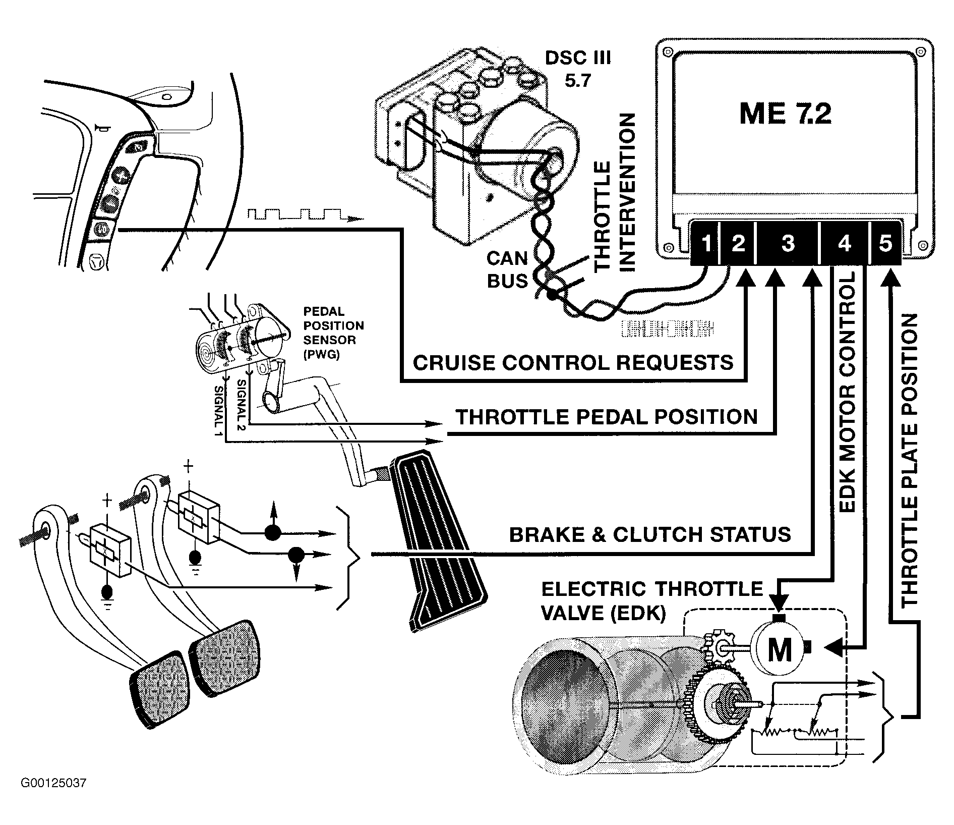 When the accelerator pedal is moved, the PWG provides a change in the monitored signals. The X5 ME 7.2 compares the input signal to a programmed map and appropriately activates the EDK motor via proportionally high/low switching circuits. The control module self-checks its activation of the EDK motor via the EDK feedback potentiometers. See Fig 1. Requirements placed on the Electric Throttle System (EML):