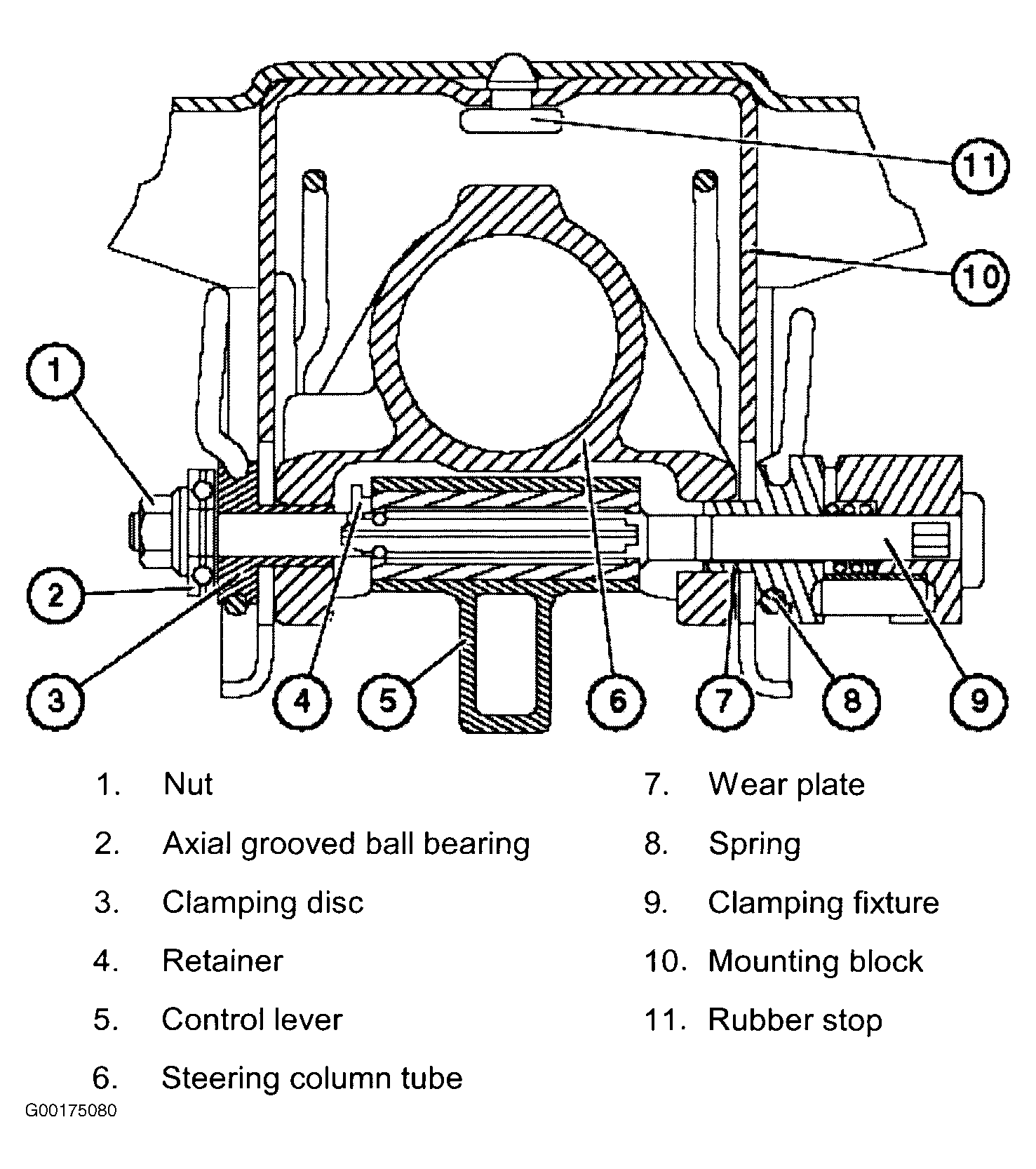 1. Press clamping fixture (9) into adjusting lever (5) with special tool (32 1 200). Adjusting lever points towards steering lock and square section on clamping fixture must be inserted in long slot in steering column tube. Fit retainer (4), clamping disc (3) and axial grooved ball pivot (2). Connect torsion spring (8) to both sides. See Fig 1.