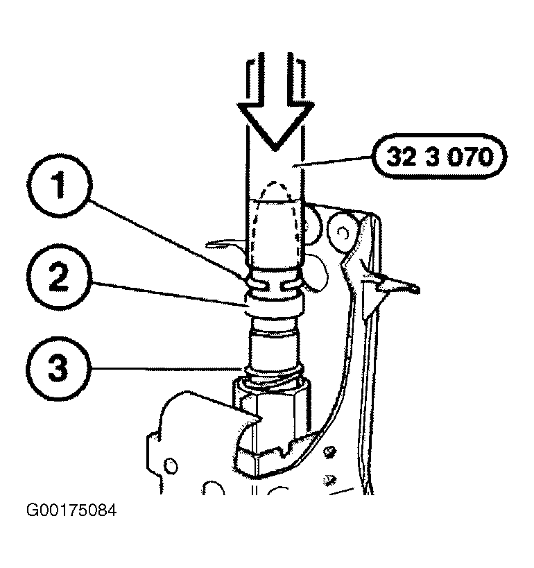 6. Fit spring (3) and end collar (2). Recess in collar must point to snap ring. Fit snap ring (1) with special tool (32 3 070). See Fig 3.