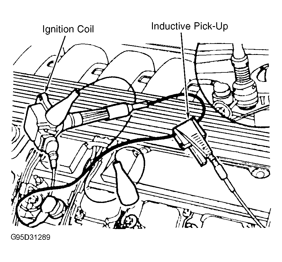 1. Connect engine analyzer and Adapter (127020) as described in IGNITION COIL PRIMARY SIGNAL CHECK . Remove ignition coil. Connect a spark plug wire (between coil and spark plug) to cylinder being tested. Connect inductive pickup Blue lead, on lead to cylinder being tested. See Fig 1.