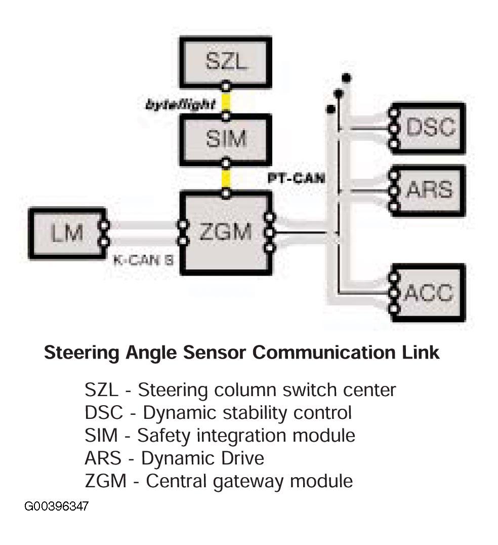 The steering angle sensor is a 3.4 k/Ohm potentiometer with two wipers offset by 90 degrees. From the two wiper signals and a reference signal, the SZL calculates the steering angle sensor position and transfers it over the Byteflight and CAN Bus to other control modules. Shorts to B+ or ground are detected as faults. See Fig 2.