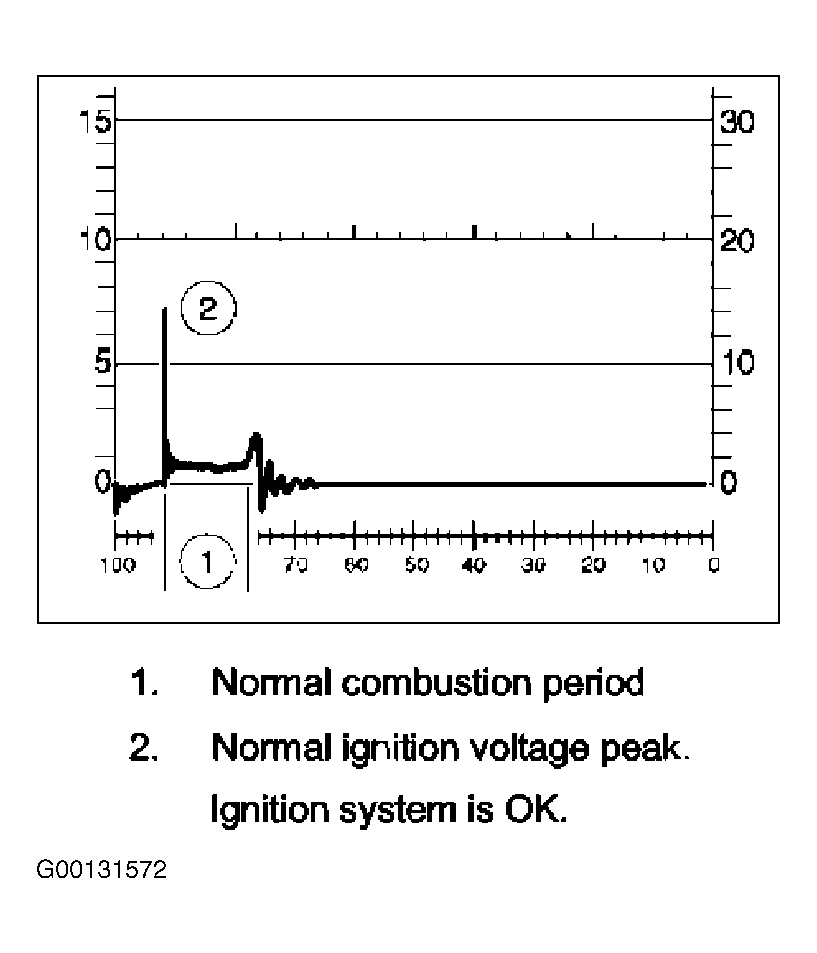 1. Evaluate sparking period and ignition voltage peaks at idle. Voltage peak No. 1 indicates normal combustion period. Voltage peak No. 2 indicates normal ignition voltage peak. Ignition system is okay. See Fig 1.