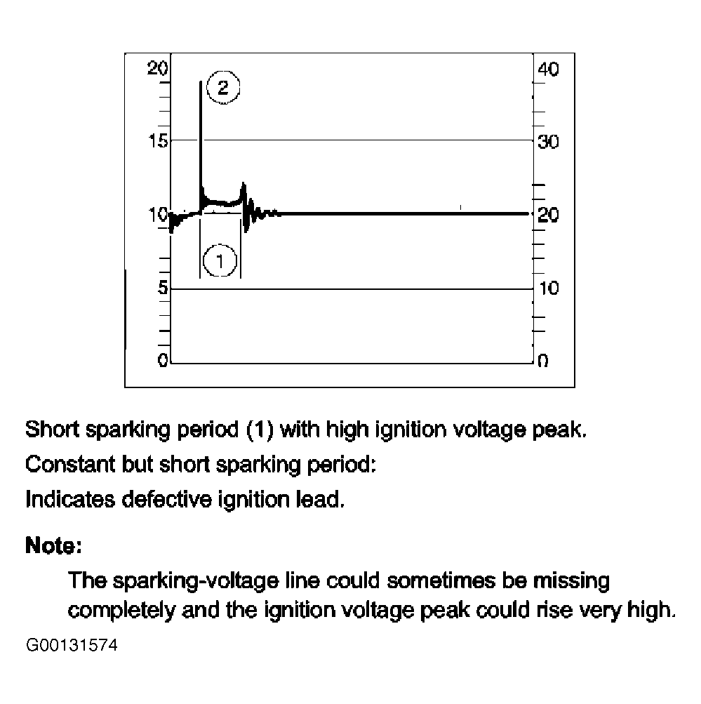 3. A short sparking period (voltage peak No. 1) with high ignition voltage peak (voltage peak No. 2) or a constant but short sparking period, indicates a defective ignition lead. See Fig 3.