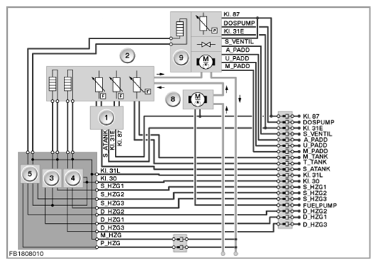 Although the components and system functions of the SCR system in BMW X5 and BMW 3-Series vehicle and vehicles derived from them are absolutely identical, integration of the SCR system is very different, due to the design envelope. The following two graphics show the schematic description of a BMW 3 Series vehicle where the entire fuel tank system is fitted below the luggage compartment in the vehicle rear area (see first illustrationFig 1) and of a BMW X5 vehicle in which the active and passive tank are installed in the front and middle half of the vehicle (see second illustrationFig 2). The components of the SCR system that can be assigned to the fuel tank system are shown. The other components of the SCR system related to the NOx sensing, SCR catalytic converter and mixture metering can be seen in the regular wiring diagrams. The electrical separation of the SCR system from the remaining wiring harness takes place by means of the multi-pin "SCR plug connector":